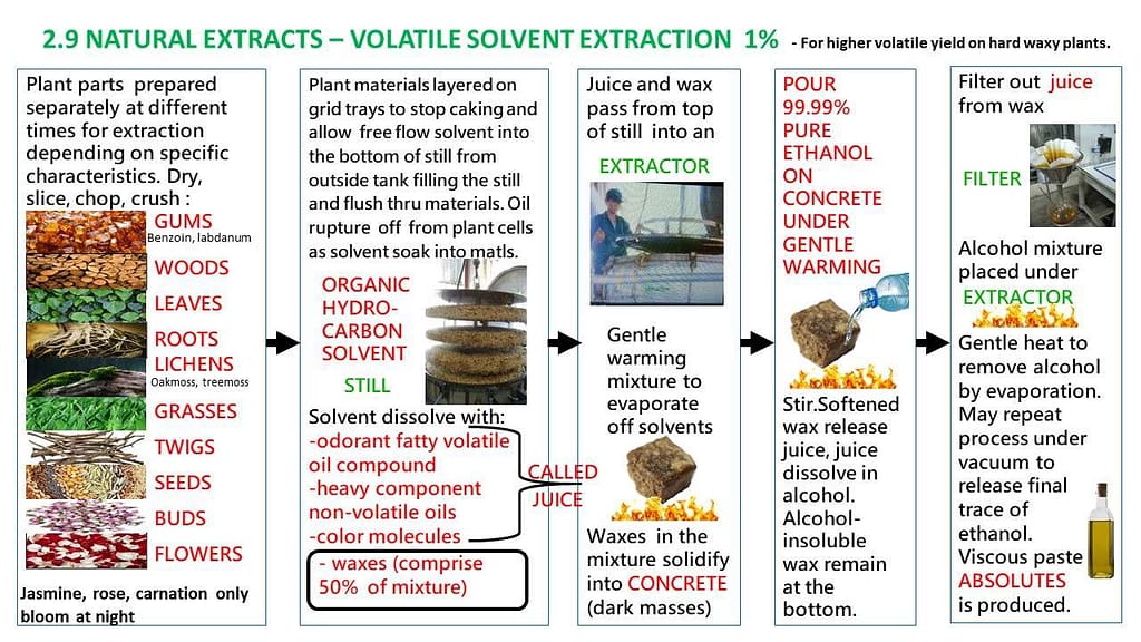 Some plant materials do not give up its fragrant oils to distillation. Jasmine or carnation flowers when steamed in a still, the waxed petals will block the tray holes. For higher volatile yields on hard waxy plants, volatile organic hydrocarbon solvents e.g. petroleum ether, hexane, cyclohexane are used to extract them. The preparation of plant materials for distillation depend on the plants specific characteristics.