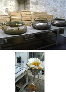 The mixture of solvent and extracts passes from the still into an extractor where gentle warming allows the volatile solvent to evaporate leaving the mixture of volatile oil, non-volatile oil, waxes and color.