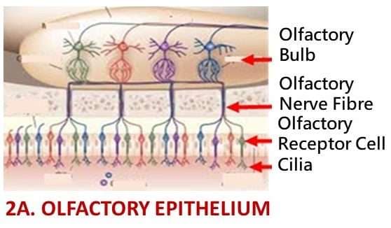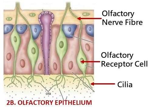 Olfactory epithelium, the specialized region of tissue lining nasal cavities, contains olfactive receptor cells, which have specialised cilia extensions.