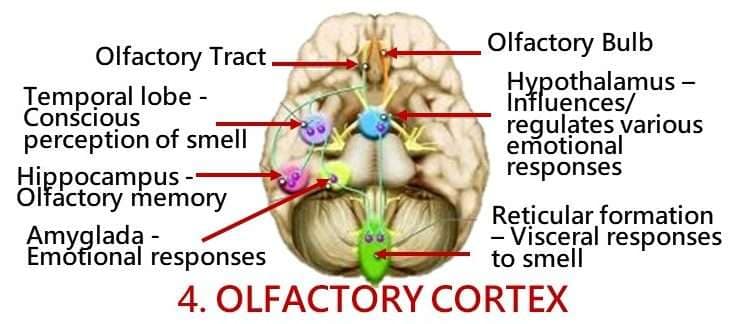 Olfactory cortex, a component of the limbic system, has connection with the limbic system structures. Eg amygdala (involved in forming emotional responses, particularly fear responses, and memories); the hippocampus (indexes and stores memories) and hypothalamus (regulates emotional responses).