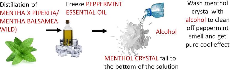 MENTHOL CRYSTAL is a natural chemical found in mint plants obtained by isolation and crystallization. Cooling/temperature method is used to separate menthol from the liquid part. No chemical reaction is involved