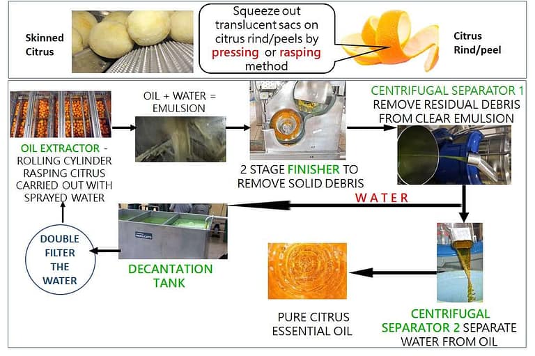 In the rasping method, essential oils come out from citrus skin upon rasping of rotating cylinders and is carried out by sprayed water. The emulsion (mixture of water and essential oil) flows into 2 stage finisher to remove the solids debris. The emulsion is pumped into a buffer tank and then to two centrifugal separators. The first one removes the residual debris, the second one separates the water from the pure essential oil. The water of the first centrifugal separator is pumped in a decantation tank, then through a centrifugal pump goes into a double filter and at the end goes back to the oil extractor to start the cycle again.