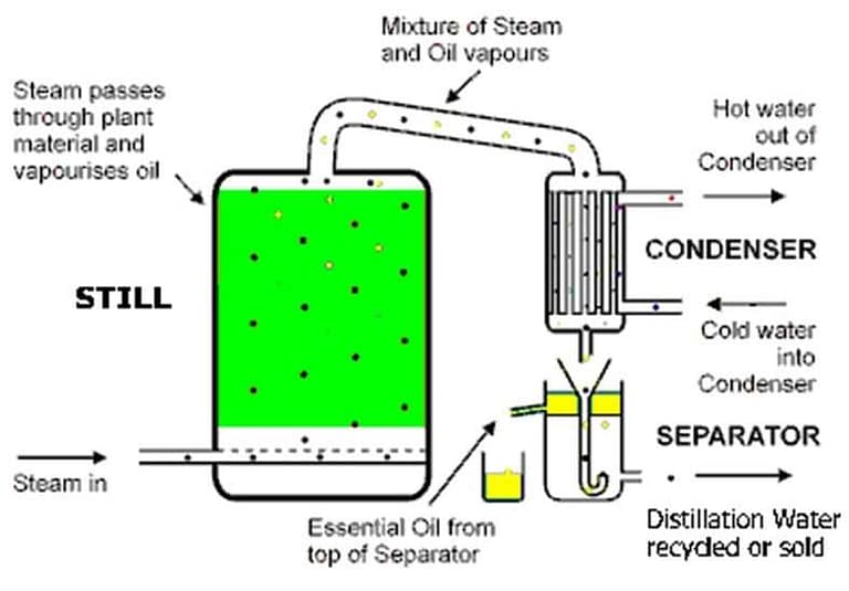 Essential oils are complex mixtures of volatile natural occurring chemical components which give its unique odour. Separately, plant parts are permeated with steam to capture the compounds that produce fragrance. Plant tissues break down to release essential oil and water vapour. Oils float on cooled water allowing it to be separated, collected and cooled. It can take several pounds of a plant to produce a single bottle of essential oil. The oil is usually light colour. Colour molecules are generally large and not volatile. The decanted water is scented and can be used directly (rose water, orange flower water etc).